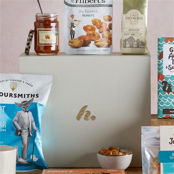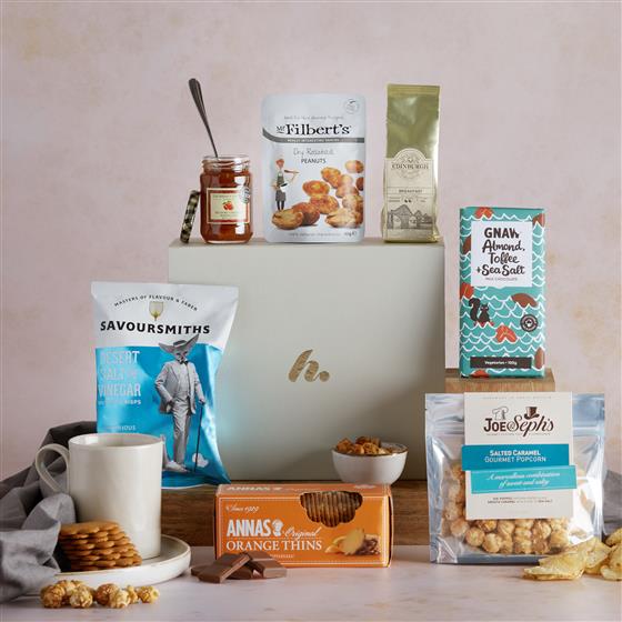 Savoursmiths Desert Salt & Vinegar Crisps 40g,Annas Orange Thins 150g,32g J&S Salted caramel snack pack,40g Filberts Dry Roasted Peanuts,Thursday Cottage Blood Orange Marmalade 113g,Edinburgh Tea and Coffee Co Breakfast Coffee 56g,Gnaw Almond Toffee & Sea Salt Chocolate bar 100g,Small Gift Box (25.5 x 21.5 x 10.5)