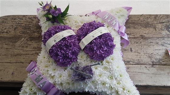 A tribute for a keen Knitter. Please Specify if you would need knitting needles or a crochect hook and the colour of your wool. For this price the arrangement is around 17 inches across.