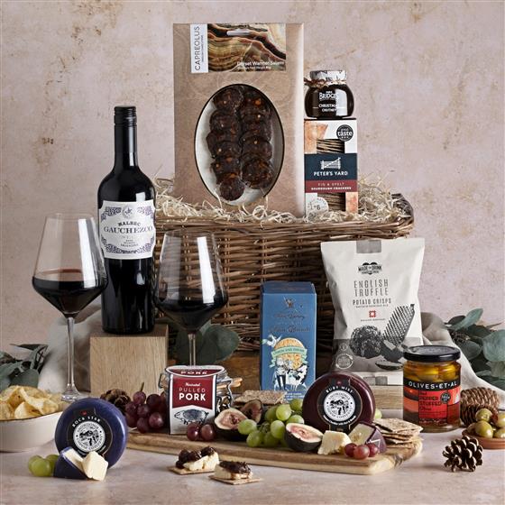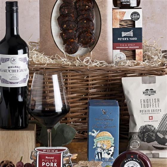 75cl Gauchezco Estate Malbec USD, 100g Peters Yard Fig & Spelt Sourdough Crackers, 100g Isle of Mull Cheese Biscuits with Onion and Thyme, 40g Made For Drink Truffle Crisps, 100g Mrs Bridges Christmas Chutney, 150g Red Pepper Stuffed Olives Olives Et Al, 200g Snowdonia Cheese Ruby Mist, 150g Snowdonia Rockstar, 80g Capreolus Dorset Warmer Salami, Marinated Pork Rillette (red packaging)