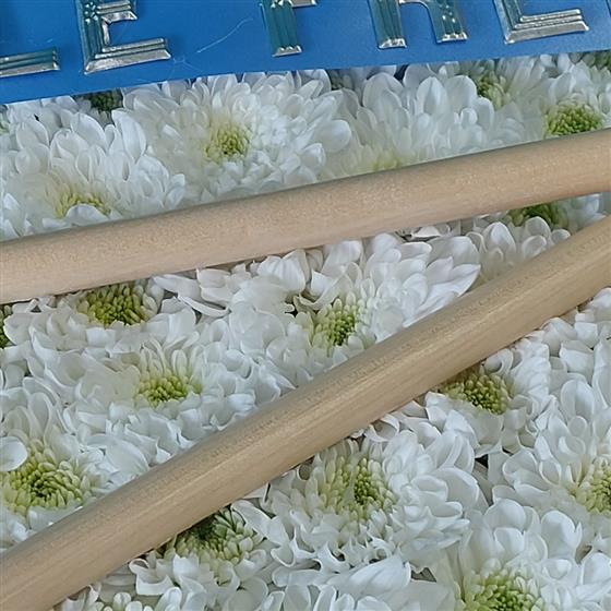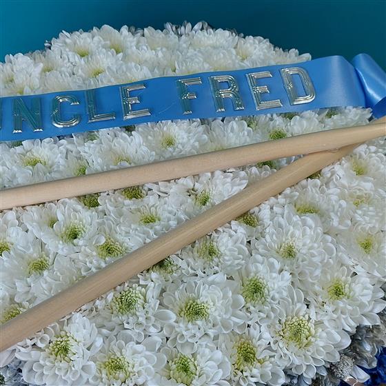 Drum in flowers with real drum sticks please specify colour. For this price the tribute is around 12 inches acros.