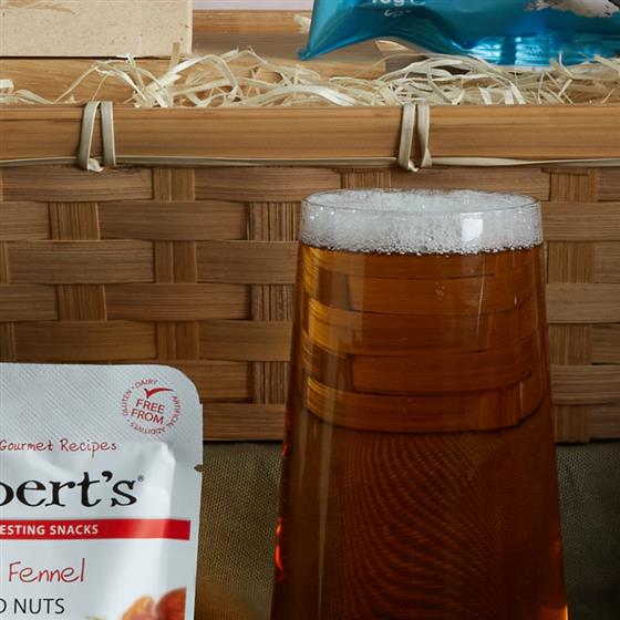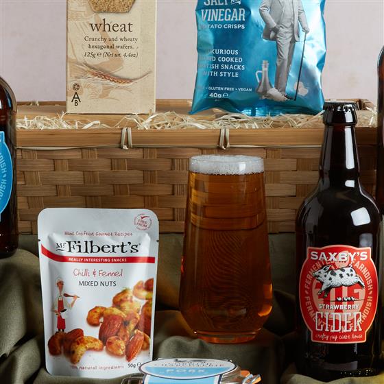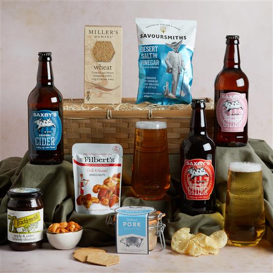 Saxbys Original Cider 500ml,Saxbys Rhubarb Cider 500ml,Saxbys Strawberry Cider 500ml,Savoursmiths Desert Salt & Vinegar Crisps 40g,Millers Damsel Wheat Crackers 125g,Filberts Chilli and Fennel Mixed Nuts 50g,Tracklements Apple & Cider Chutney 315g,Pork Rillette 125g,Large Chesnut Coloured Bamboo Tray(380X300X100).