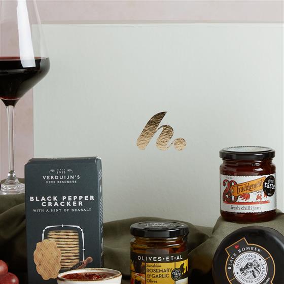 Royal Road Malbec, 75g Verduijns Savoury Black Pepper & Seasalt Crackers, Tracklements Fresh Chilli Jam 220g, Olives Et Al Sunshine Rosemary & Garlic Olives 150g, Snowdonia Cheese Co Black Bomber 200g, Large Gift Box Outer 335 X 277 X 125mm.