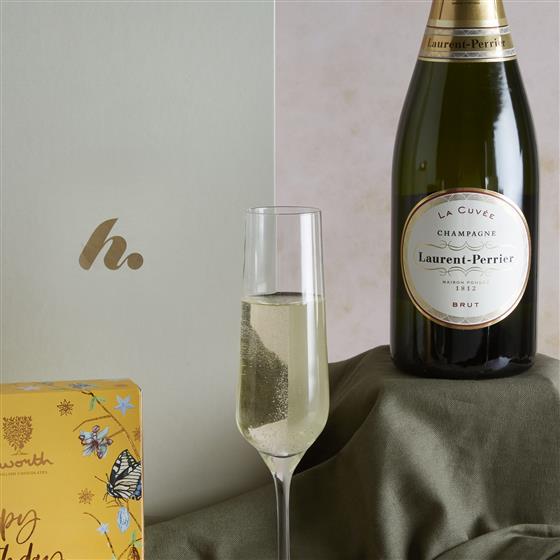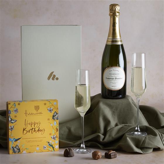 Laurent Perrier Champagne 75cl,Holdsworth Happy Birthday Chocolates 110g,(34.5 x 20 x 10.5),Medium Gift Box Outer 350mm x 207mm x 110mm.