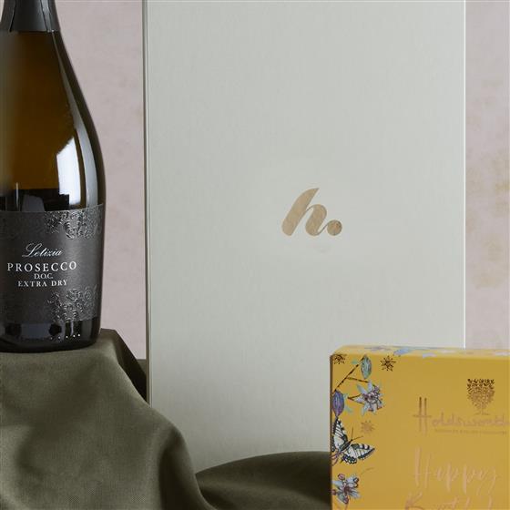 75cl Letizia Prosecco Spumante DOC Extra Dry,Holdsworth Happy Birthday Chocolates 110g, Medium Gift Box Outer 350mm x 207mm x 110mm.