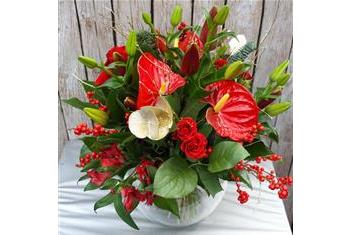 This beautiful bouquet includes red lily, red ilex berries, red mini anthuriums, red alstromeria, spray red roses and finished of with gold and natural euacalyptus and pinus.
