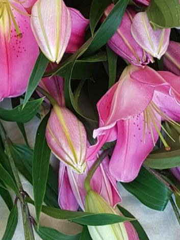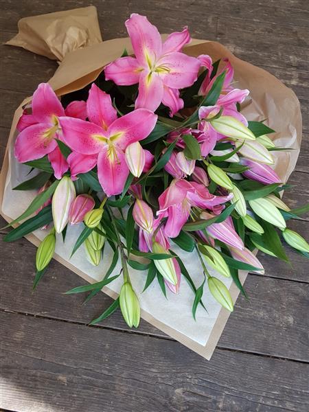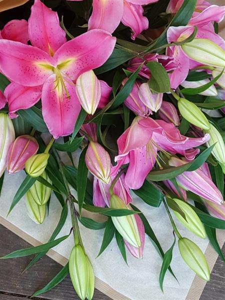 Just Best Pink Oriental Lilies. Each stem will have a minimum of 4-5 heads. Wrapped in paper and tissue.