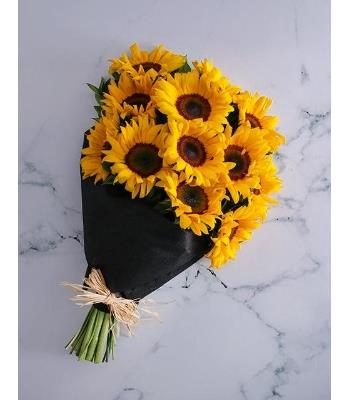 Just large headed, long stem sunflowers in paper wrap with natural raffia bow.