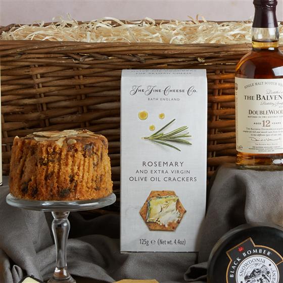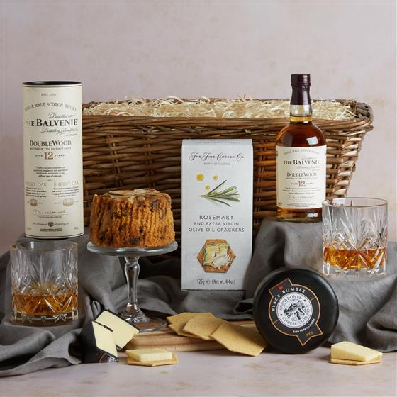 The Balvenie Doublewood 12 year old Whiskey 20cl,Fine Cheese Co Crackers with Rosemary 125g,Gold Crown 4" Round Whisky Dundee, Snowdonia Cheese Co Black Bomber 200g,360mm/14", Small Rustic Willow Basket 340 x 230 x 140.