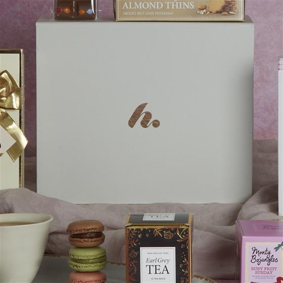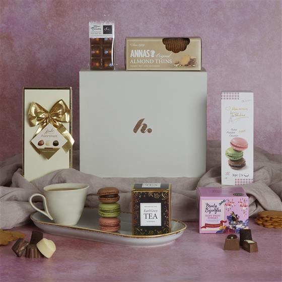 Macaroons de Pauline (3 Pack),Annas Almond Thins 150g,Grey and Gold Earl Grey 10 teabag,38g CCC Milk Choc With Beans, Ivory Hamlet Chocolates 125g,Monty Bojangles Ruby Fruit Sunday Truffles 100g, Small Gift Box Outer.