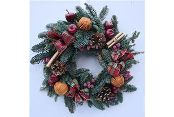 A traditional wreath that includes tartan ribbons, whole oranges, cones, cinnamon sticks, red berries and red apples.