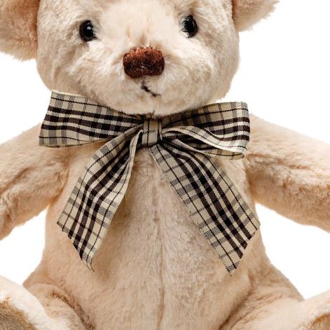 Loveable ivory coloured smartly dressed bear with plaid ribbon bow tie; hand wash & air dry, suitable from birth upwards
