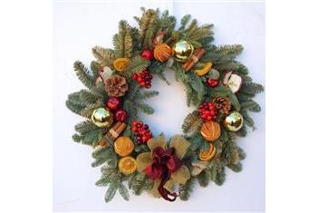 A 12" traditional wreath that includes whole oranges, cones, cinnamon, orange slices, red berries, red apples and gold baubles.