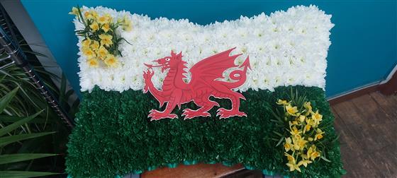 A Welsh flag, with a flower base, red printed Dragon and silk Daffodils- Fresh Daffodils will be used if in season. for this price the tribute is around 24 inches across.