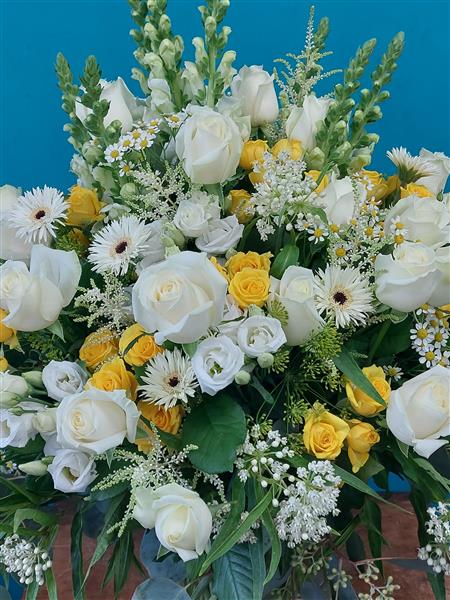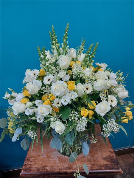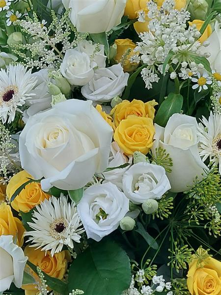 White and yellow flowers arranged together in a classic way.