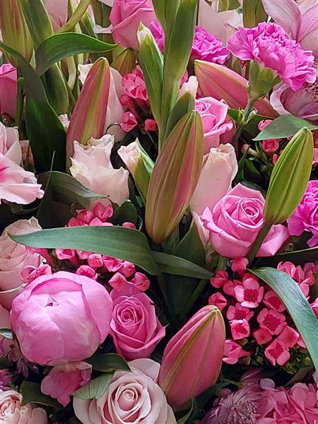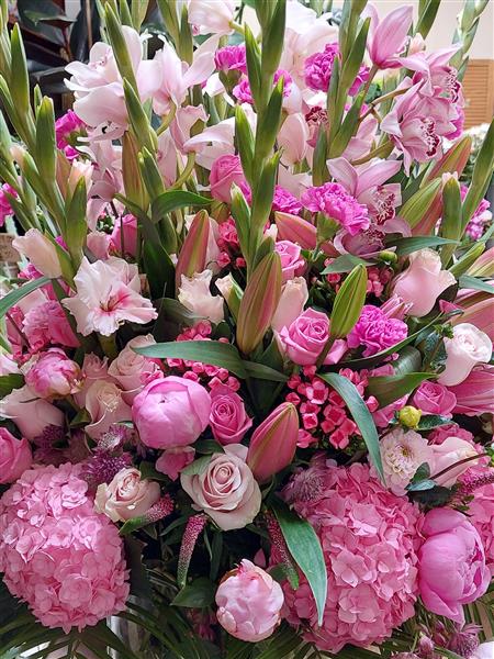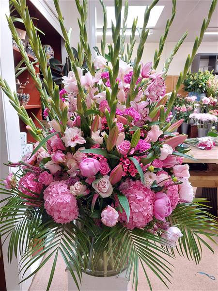 This vase is full of all the wonderful pink blooms of the season and is one of our showstopping displays!