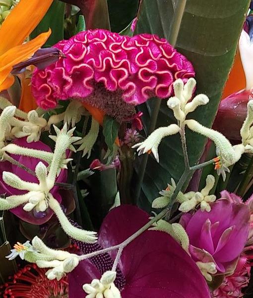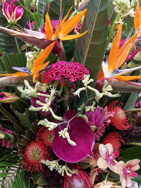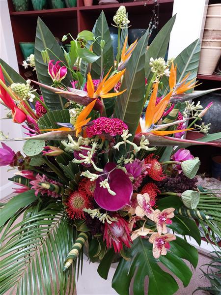Love tropical flowers? This super large vase arrangement shows all the unusual flowers off with a wow.