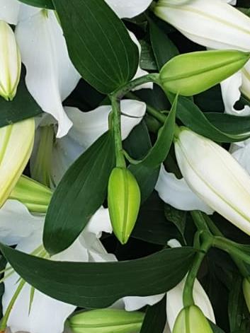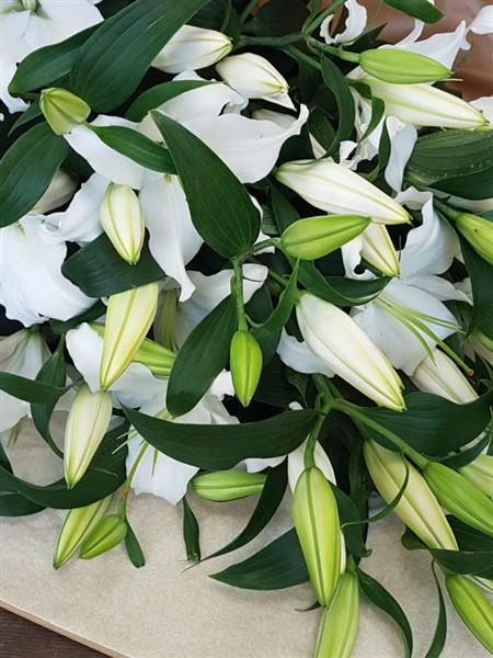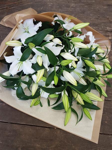 Just Best White Oriental Lilies. Each stem will have a minimum of 4-5 heads. Wrapped in paper and tissue.