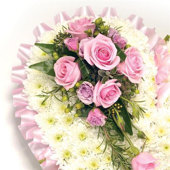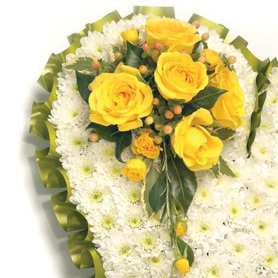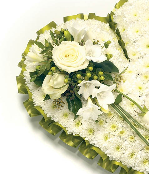 Classic chrysanthemum based heart shaped tribute with Roses, Freesia & Hypericum and complementary ribbon edge. Please choose your colour. Size- standard 12 inches, medium 15 inches and large 18 inches