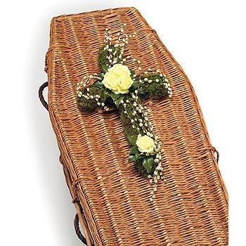 Mossed cross with white roses Standard price shown is for a 1ft tribute arrangement.